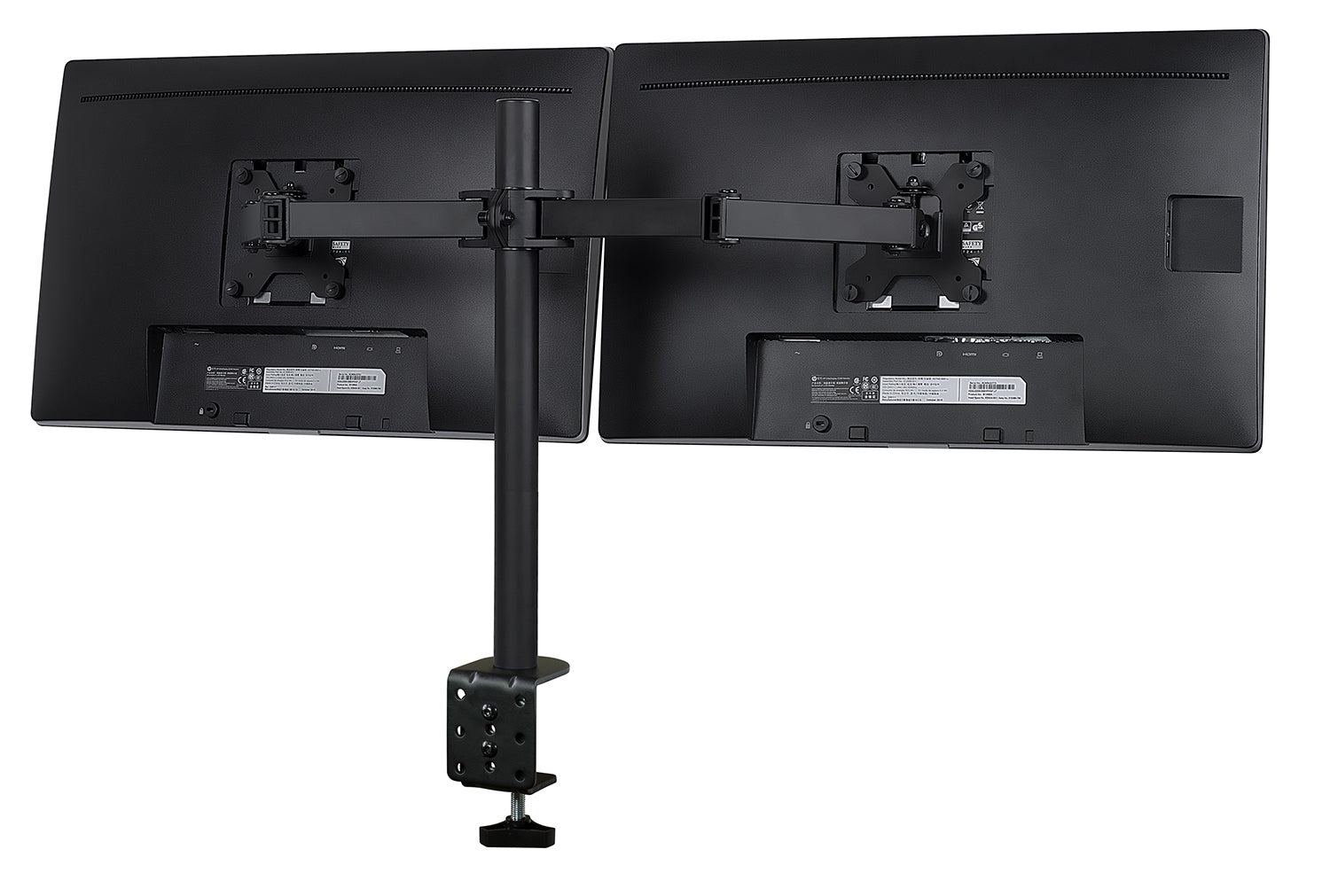 Raise your monitors to an ergonomic position and work more efficiently with this dual monitor mount. Designed for performance, this mount is made from high-strength steel for durability. Includes both clamp and grommet installation components to fit a variety of desks. The arms can be raised and lowered on the pole for easy height adjustment. Tilt and swivel offer multiple monitor angles for comfortable reading, and integrated cable management keeps your cords off your desktop.