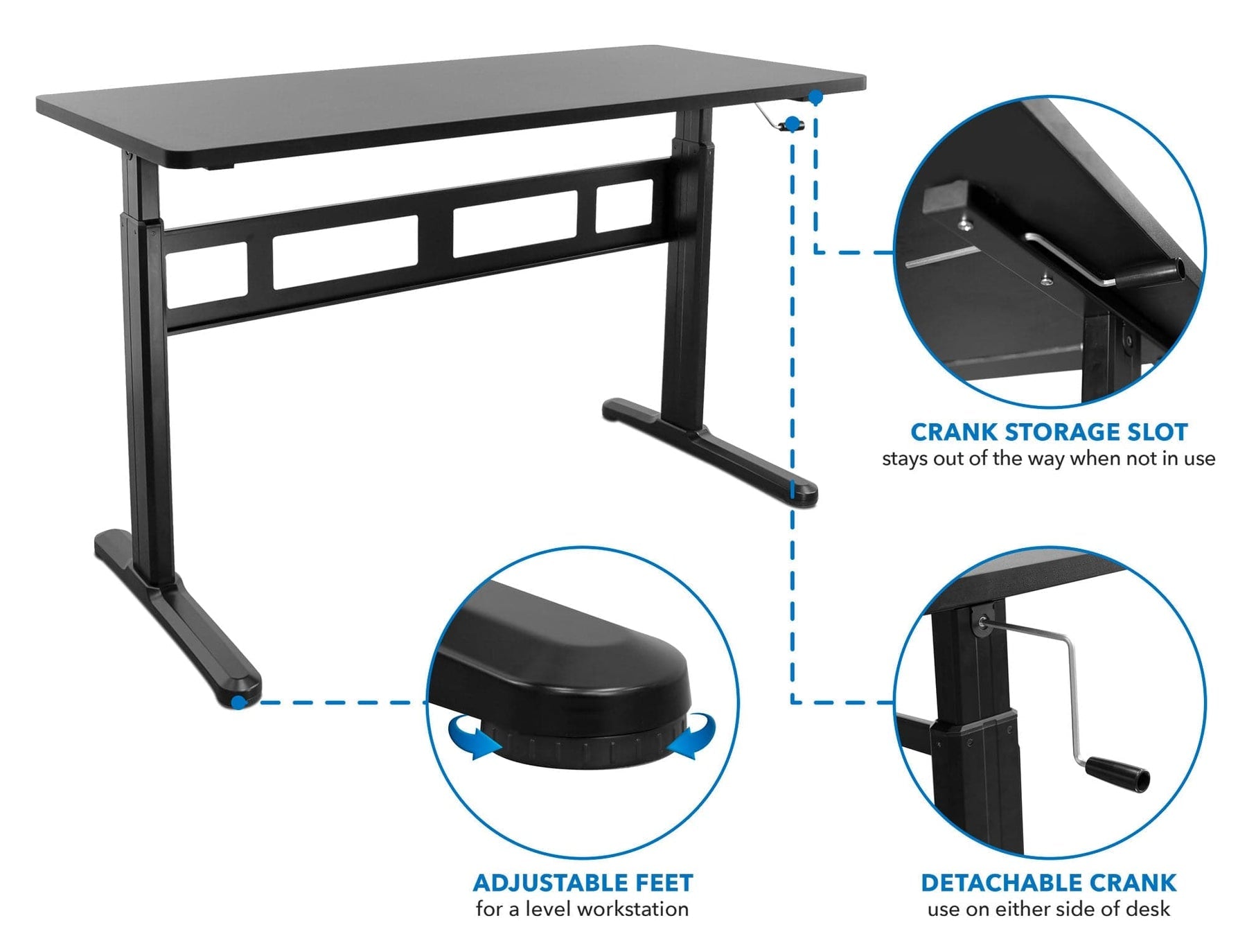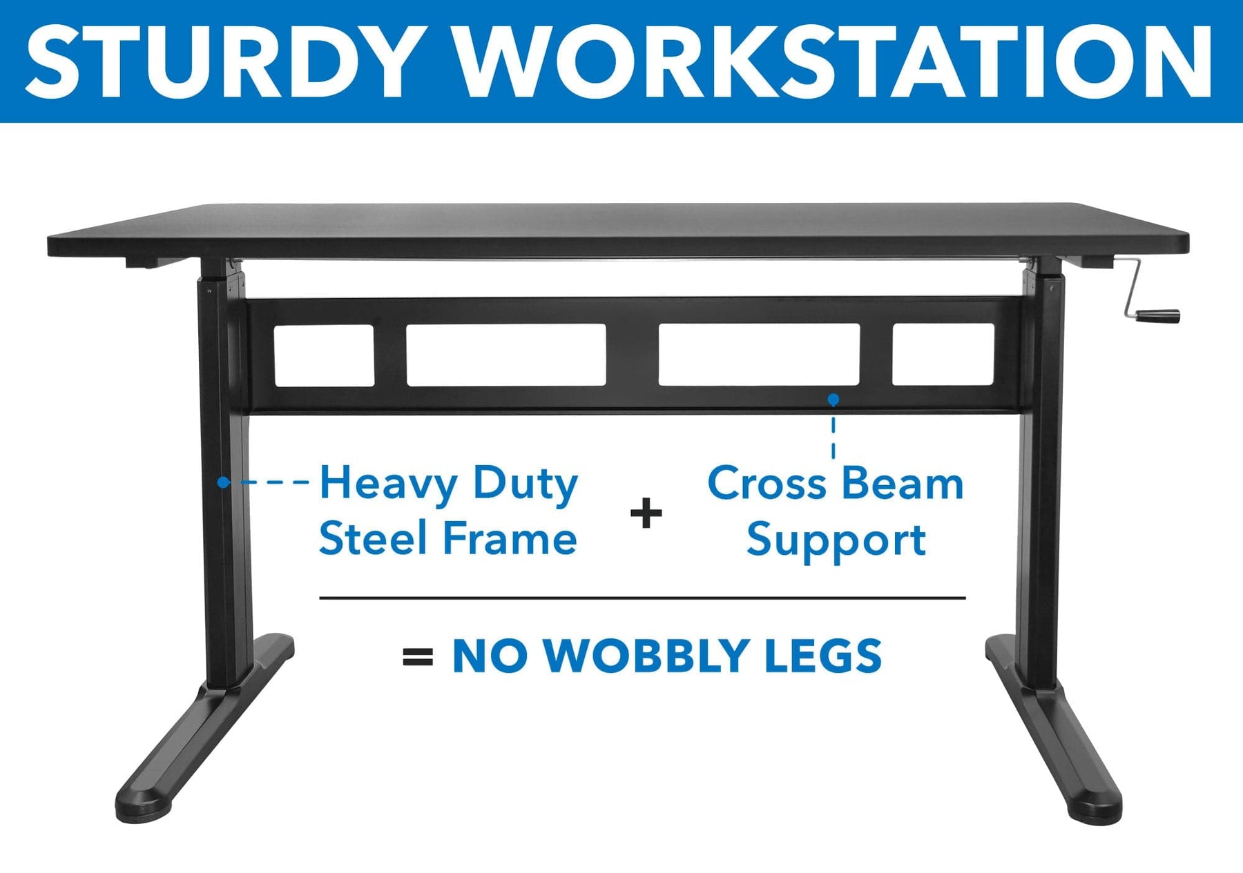 This manual height adjustable frame is perfect for the office, schools, home, and most working environments. Easy to operate and quiet hand crank adjusts the desk height, allowing you to go from sitting to standing in seconds. The durable steel frame with a sturdy crossbar provides a durability that is sure to withstand heavy and repeated use. Utilize the adjustable feet to create a level workspace in any environment. Go above and beyond and add an anti-fatigue floor mat or an under-desk CPU mount to your setup! Use this ergonomic sit-stand desk as a long term investment for both your employees and your business.