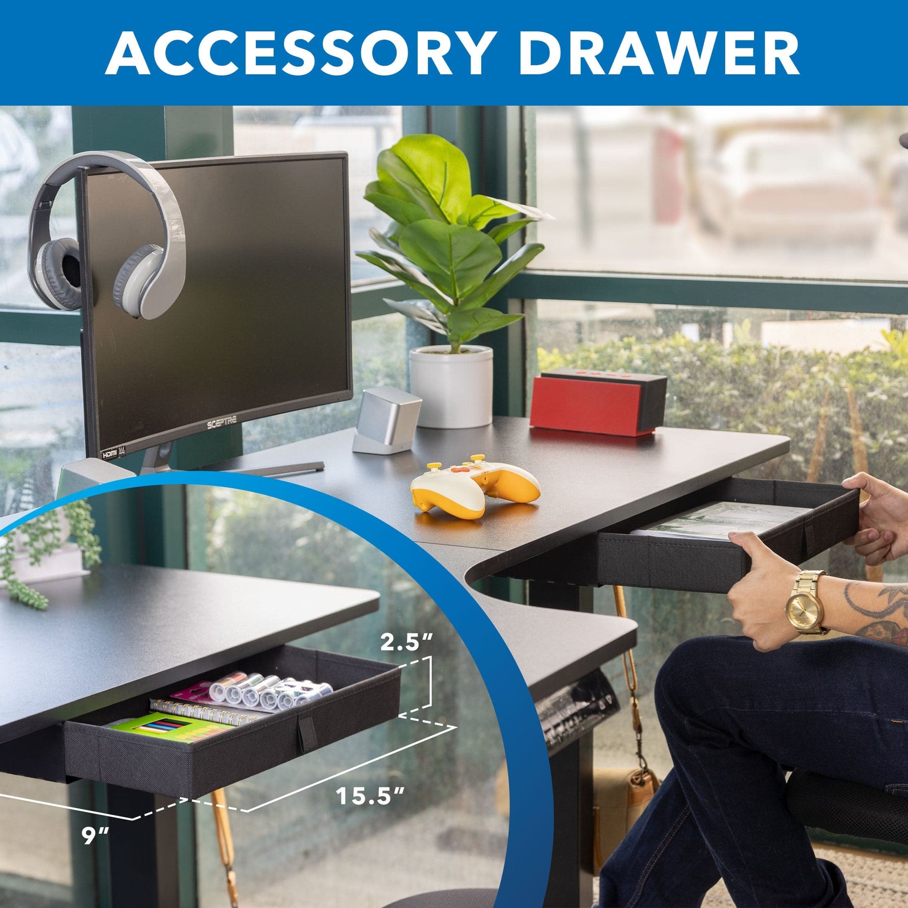 Add movement to your working day without compromising on valuable desk space with this L-shaped height adjustable desk. Switch between sitting and standing at the simple push of a button. The advanced LED control panel comes with three memory settings for your preferred sitting and standing heights. The integrated anti-collision function ensures that your desk does not bump into objects such as filing cabinets when it is lowered. To help you stay organized, the desk features a cloth drawer, two hooks for bags or headphones and cable management for neat cable routing. Two motors ensure smooth and quiet height adjustment between 28.3 and 47.2 inches. To provide you with utmost flexibility when it comes to choosing the best space for your desk, the corner desktop piece can be installed on either the left or the right side.