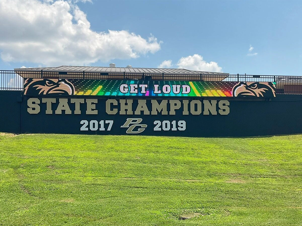 Give fans a 360° experience with fascia and ribbon boards. These custom displays showcase real-time updates like game stats, conference scores, stats, player info, and unique fan-focused sponsorships. These displays are made for indoor and outdoor applications.