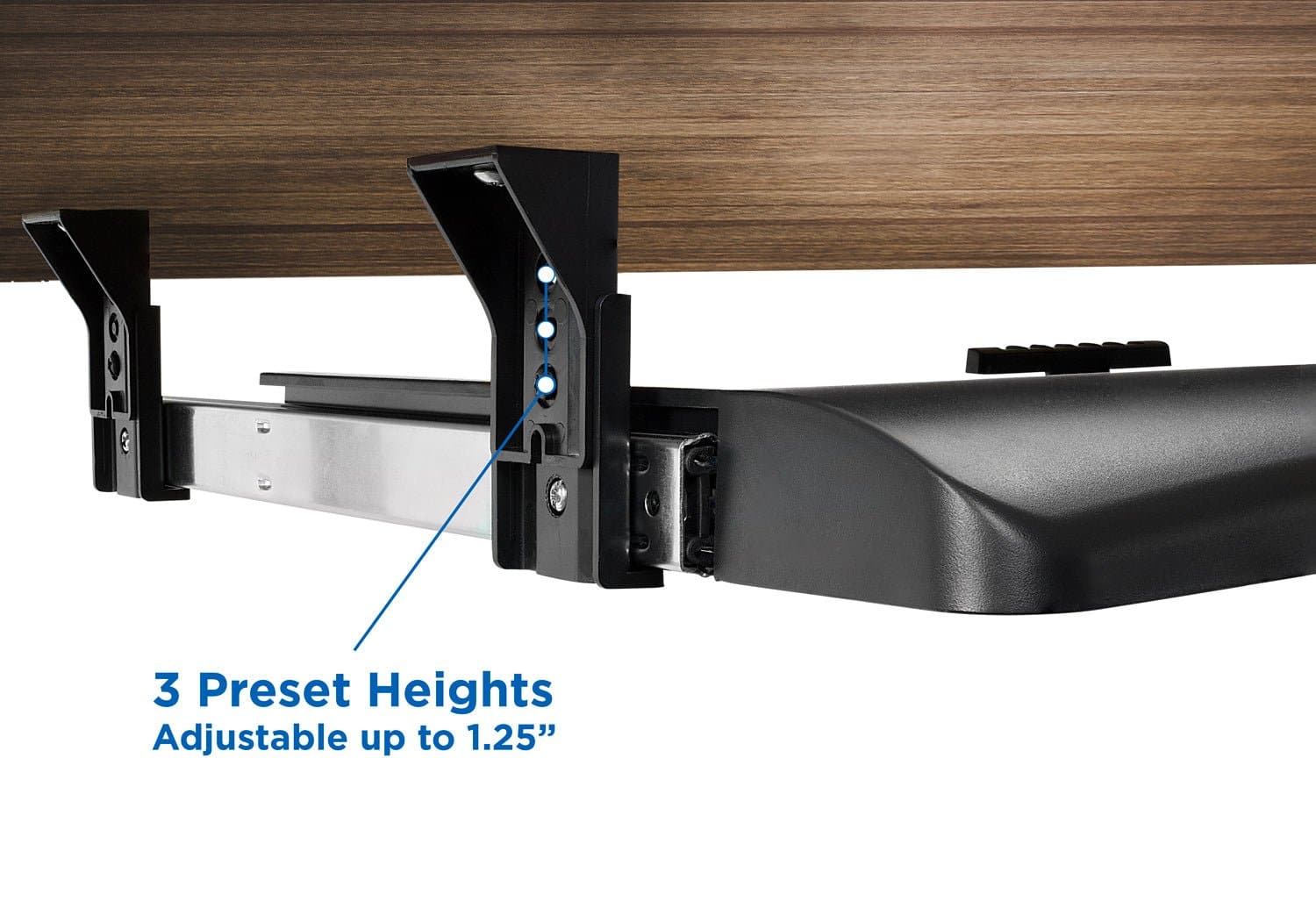 Free up desk space with MI-7136 and store your keyboard and mouse below your desk. The keyboard drawer offers ample keyboard and mouse space and stows away when not in use. The dedicated mouse platform can be installed on either the right or left side of the keyboard platform. Slides out easily with smooth steel ball-bearing glide tracks. The 3 different height levels help you position it ergonomically. Sliding clamp securely locks your keyboard in place.